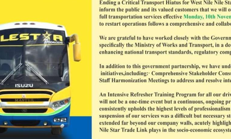 “Ending a critical transport hiatus for West Nile, Nilestar is pleased to inform the public and its valued customers that we will officially resume our full transportation services effective Monday, November 10, 2025. This decision to restart operations follows a comprehensive and collaborative period of preparation,” the notice reads in part.